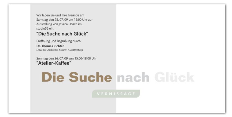 "Ein helles, lichtdurchflutetes Atelier, geschmückt durch allerlei Zitate und Bilder im Raum, lädt schon auf den ersten blick zum genaueren Hinsehen und Ausprobieren ein. In der Mitte, an einem großen Tisch sitzen fünf Kinder, die auch schon eifrig mit Pinsel und Farbe experimentieren. Jessica Hösch hat an diesem Samstagnachmittag Kinder ab 6 Jahren zu einem "Glücksworkshop" eingeladen. Seit Januar 2009 hat sie hier ihr "Studio56-der Gesellschaftsraum" in dem sie auch unter der Woche Kunstkurse für alle Altersstufen anbietet. Neben Schnupper-, Einzel- und Gruppenstunden, gibt es am Wochenende häufig wechselnde Workshops als Angebot. Ihr Handwerk hat Frau Hösch von der Pike auf gelernt, sie ist studierte Kunsttherapeutin und Pädagogin. Sie hat auch das "kidsproject - Kinder helfen kranken Kindern" gegründet.