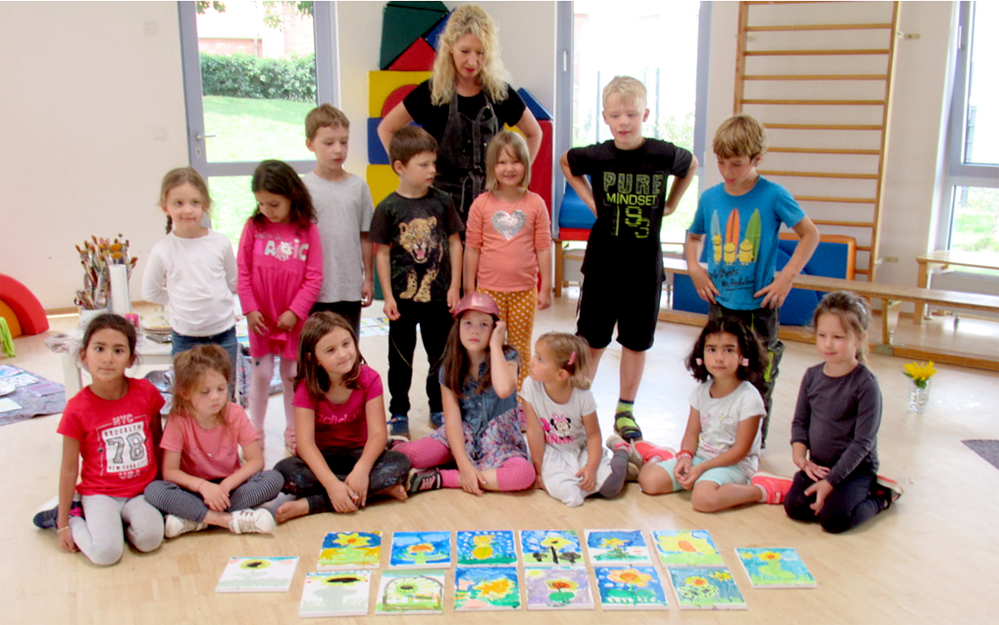 Zitat von Karin Schreck, Kindergartenleiterin: „Im Malkurs konnte jedes Kind zu sich finden, sie sind richtig zur Ruhe gekommen, zwischendrin war es ganz still, obwohl so viele Kinder mitgemacht haben. Nach Anregung der Künstlerin Jessica Hoesch, konnten die Kids richtig ihre Vorlieben und Fertigkeiten entdecken, sehr eigenständig gestalten und ihre Ideen wiedergeben. Ich war sehr freudig überrascht von den Ergebnissen, ganz toll."